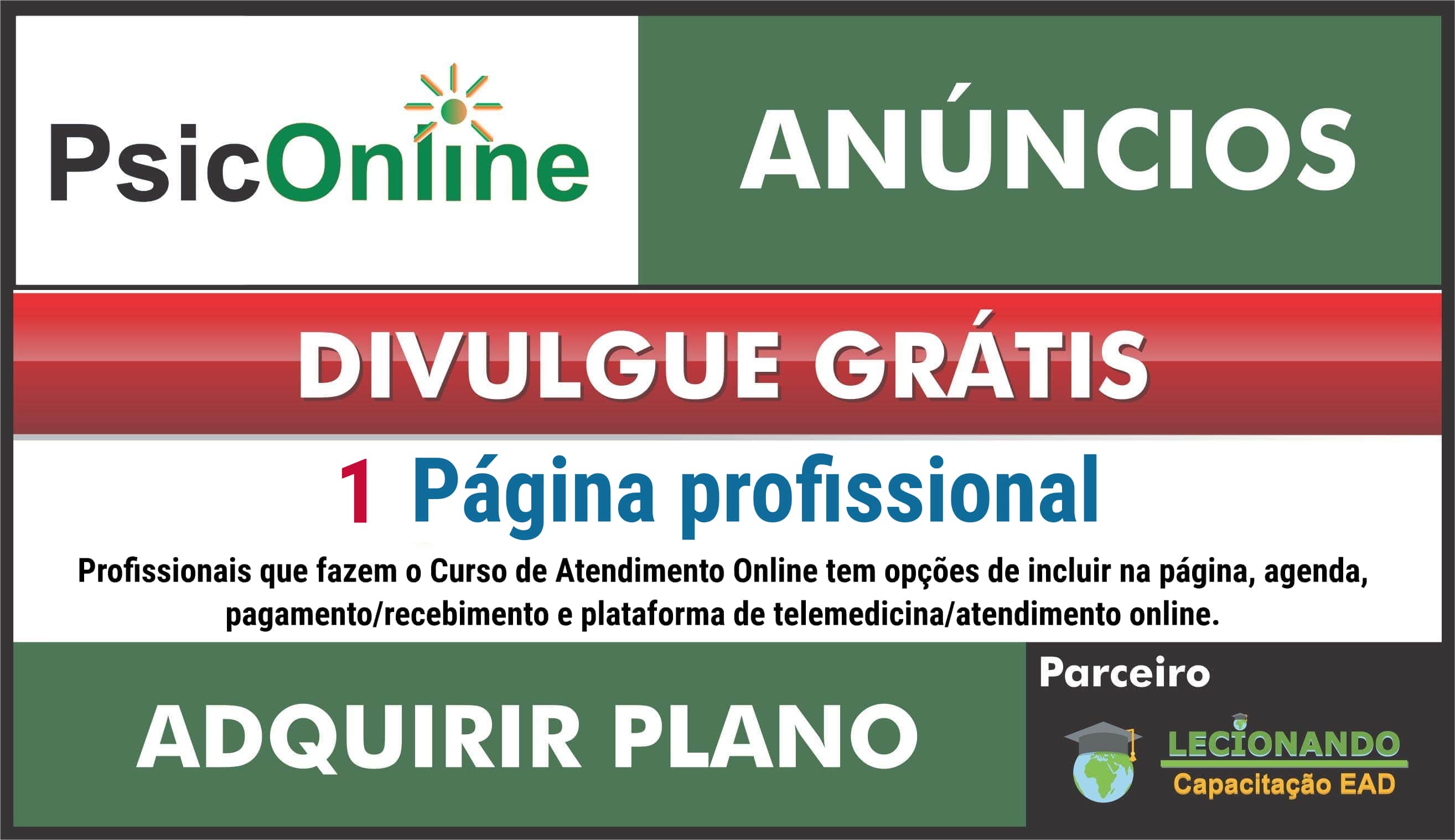 Realizar o cadastro no site, escolher a modalidade de divulgação que poderá ser: GRATUÍTO (por tempo determinado).Psicólogos que realizaram o curso de Capacitação em atendimento online na plataforma Lecionando tem gratuidade por um ano ou; anunciar através de pagamento de um dos planos de divulgação no site.
